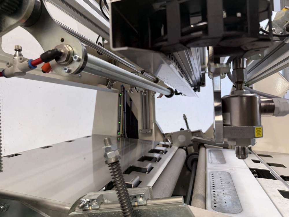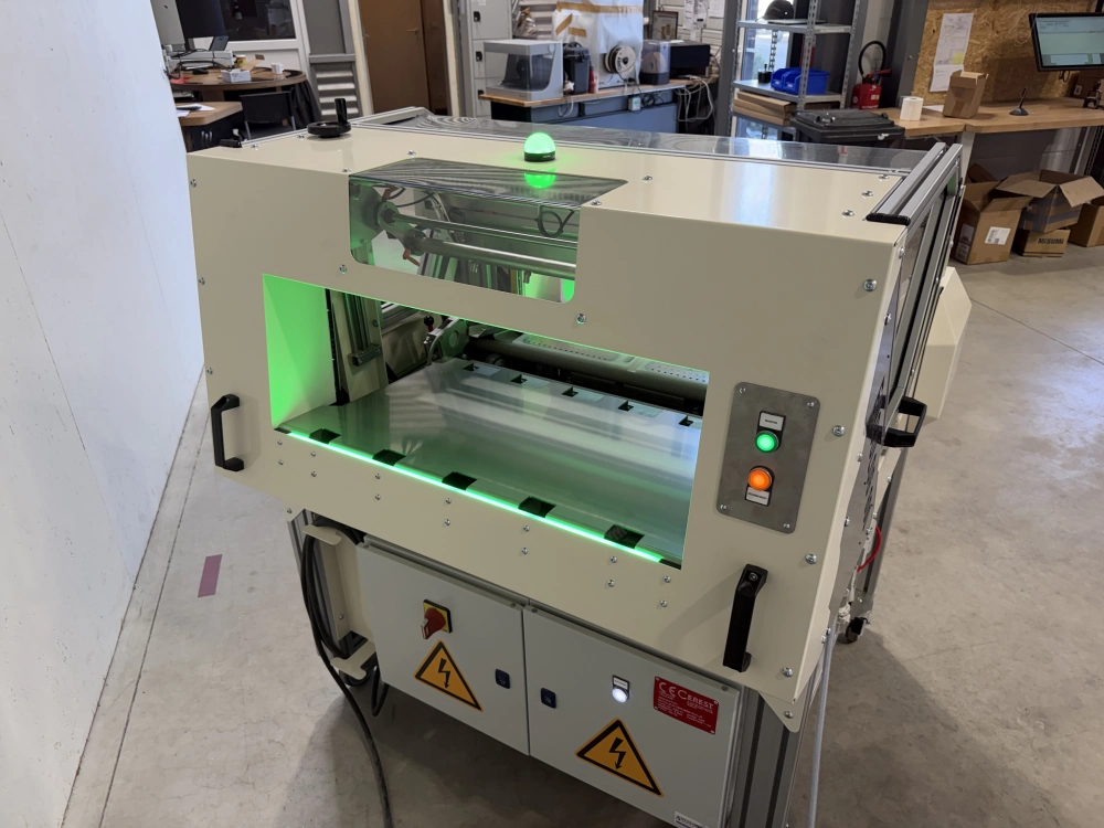 Grâce à des cellules laser, la présence de la feuille est contrôlée avec précision avant l’application du trait de colle. Une fois la position validée, un vérin linéaire déplace la tête de collage.