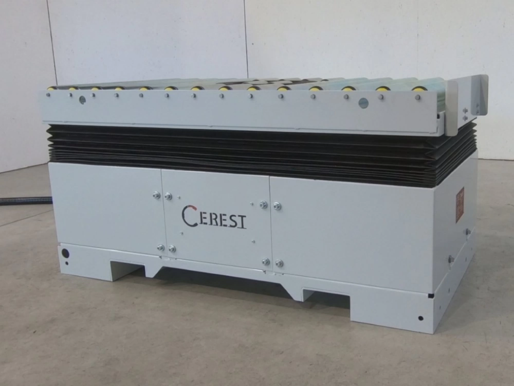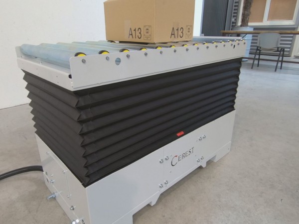 Der Hubtisch ist mit Handhabungsrollen und einem Drehkranz ausgestattet.